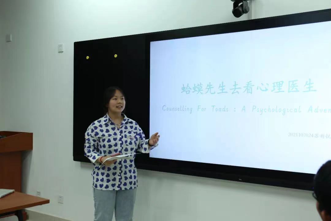 21级苏新悦同学从作者简介入手,就章节内容、专业解释、语句摘录三方面为大家整体介绍了一本关于心理咨询的心理疗愈读物《蛤蟆先生去看心理医生》,给大家展现了经过一次次心理咨询后,人们行为和情绪的控制、疗愈和改变的发生、人生和意义的领悟。同时,向大家表达了我们每一个人都应该勇于探索自己的内心世界,去寻找深入本真的自我,去平衡容易被打破的心理,走向更深层次的蜕变。