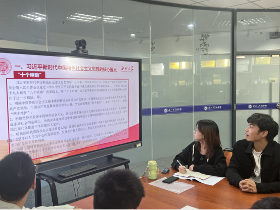 其中崔钰涵同学谈到:“深学细悟习近平新时代中国特色社会主义思想的理论体系和核心要义,对于实现社会主义现代化和中华民族伟大复兴总任务,明确新时代推进中国特色社会主义事业“五位一体”总体布局等具有重要意义。吾辈青年当牢记使命,接续奋斗,为促进中国特色社会主义事业新发展,实现中华民族伟大复兴不懈奋斗。”